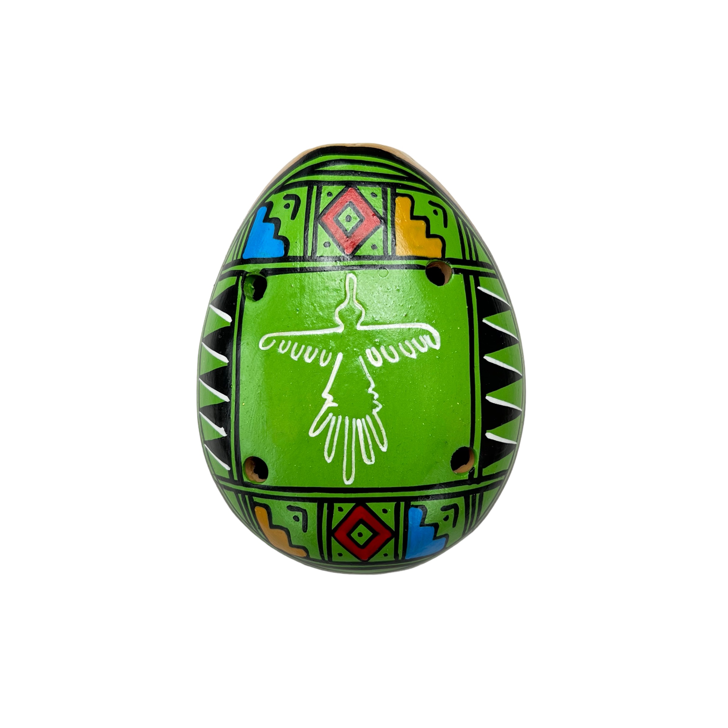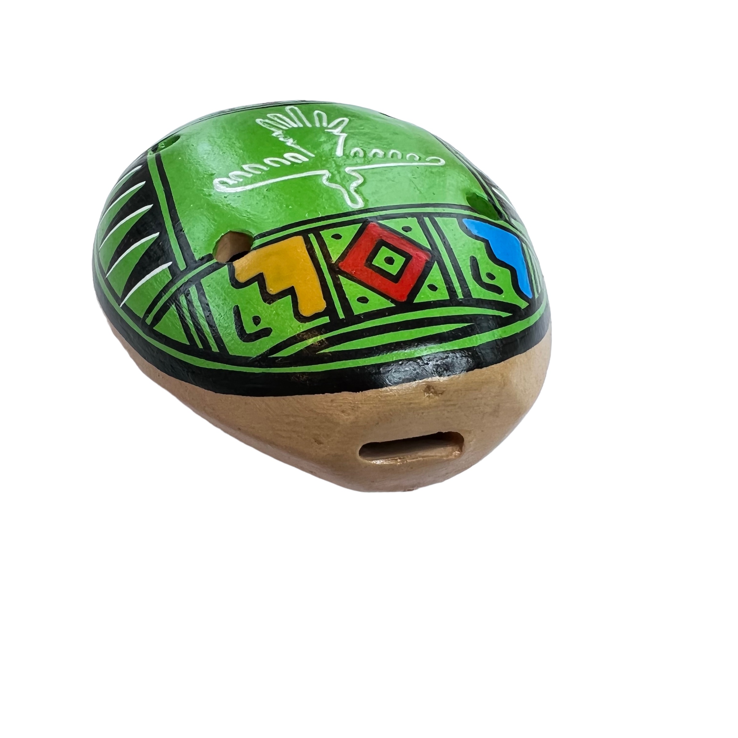 Wind musical instrument, made of clay, small, oval and slightly elongated, with six holes (two below and four above) is played like the flute.