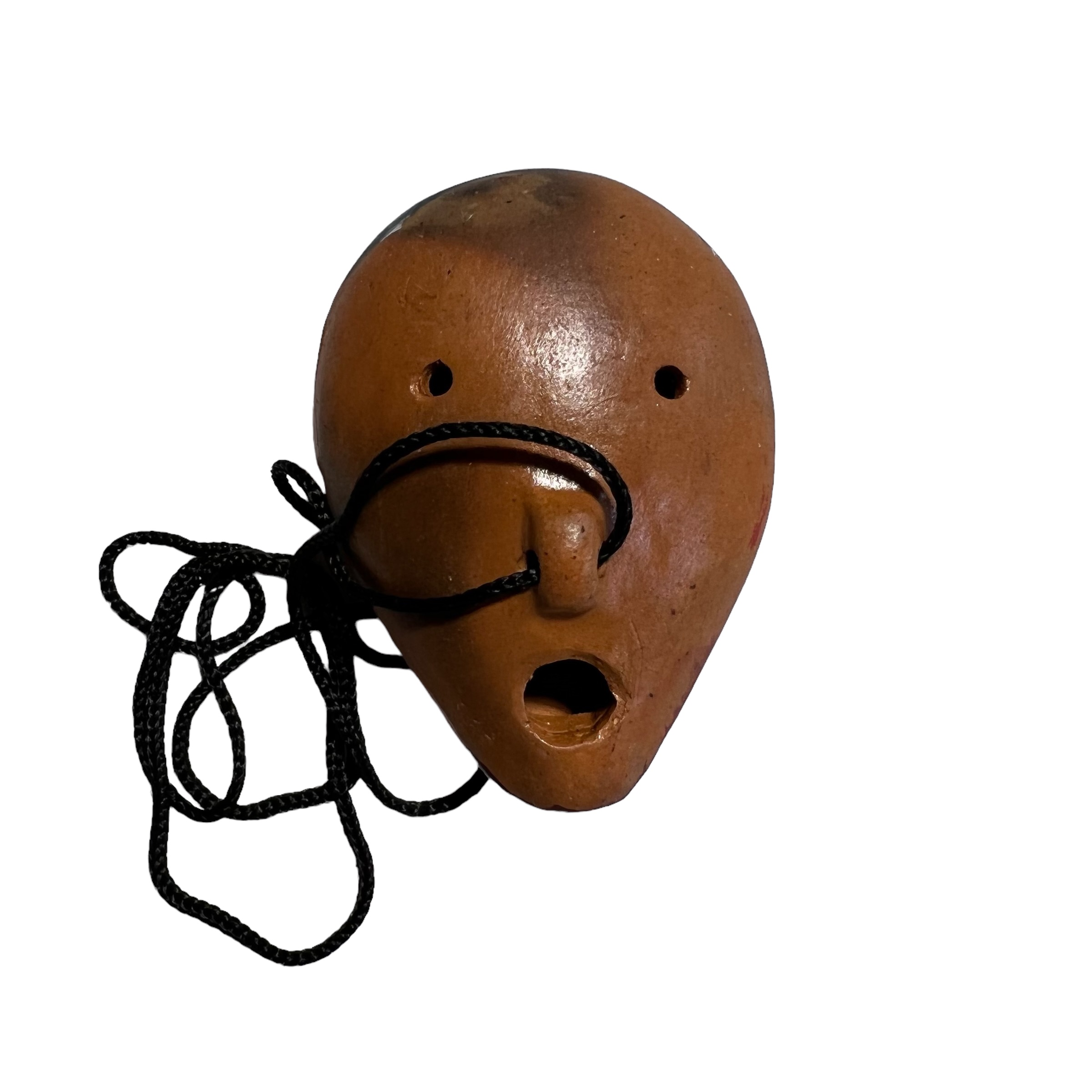 Instrument de musique à vent, en argile, de petite taille, de forme ovale et légèrement allongée, comportant six trous (deux en dessous et quatre au dessus) se joue comme la flûte.