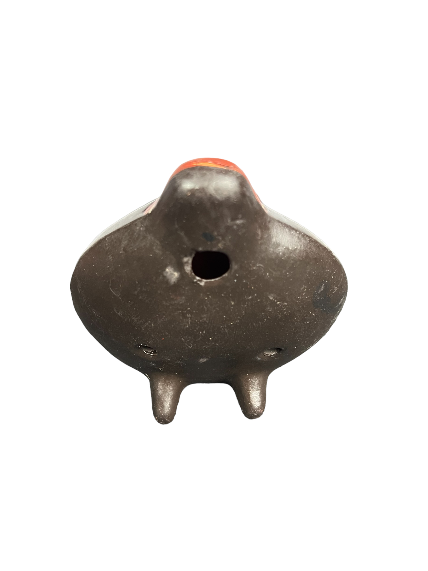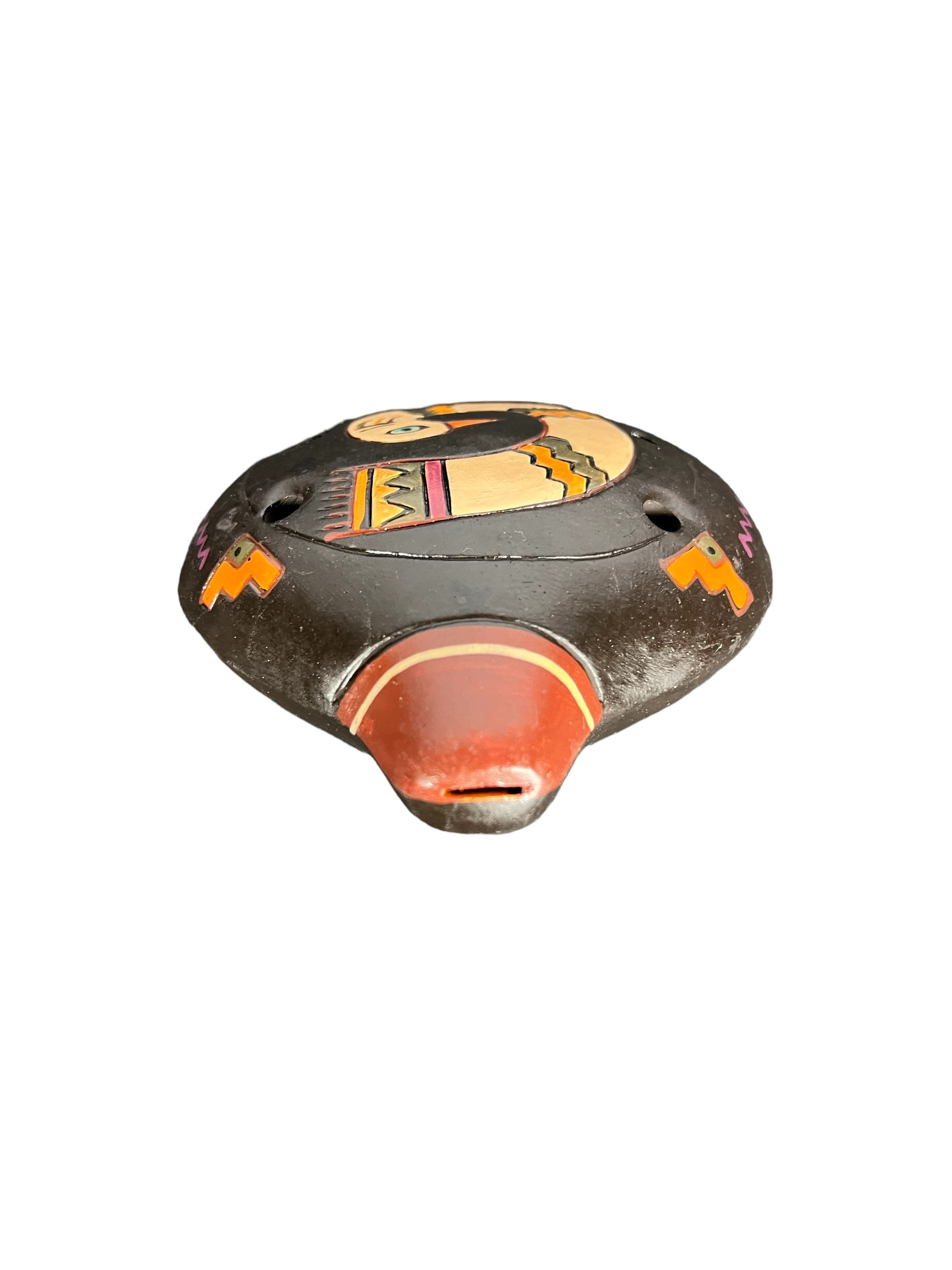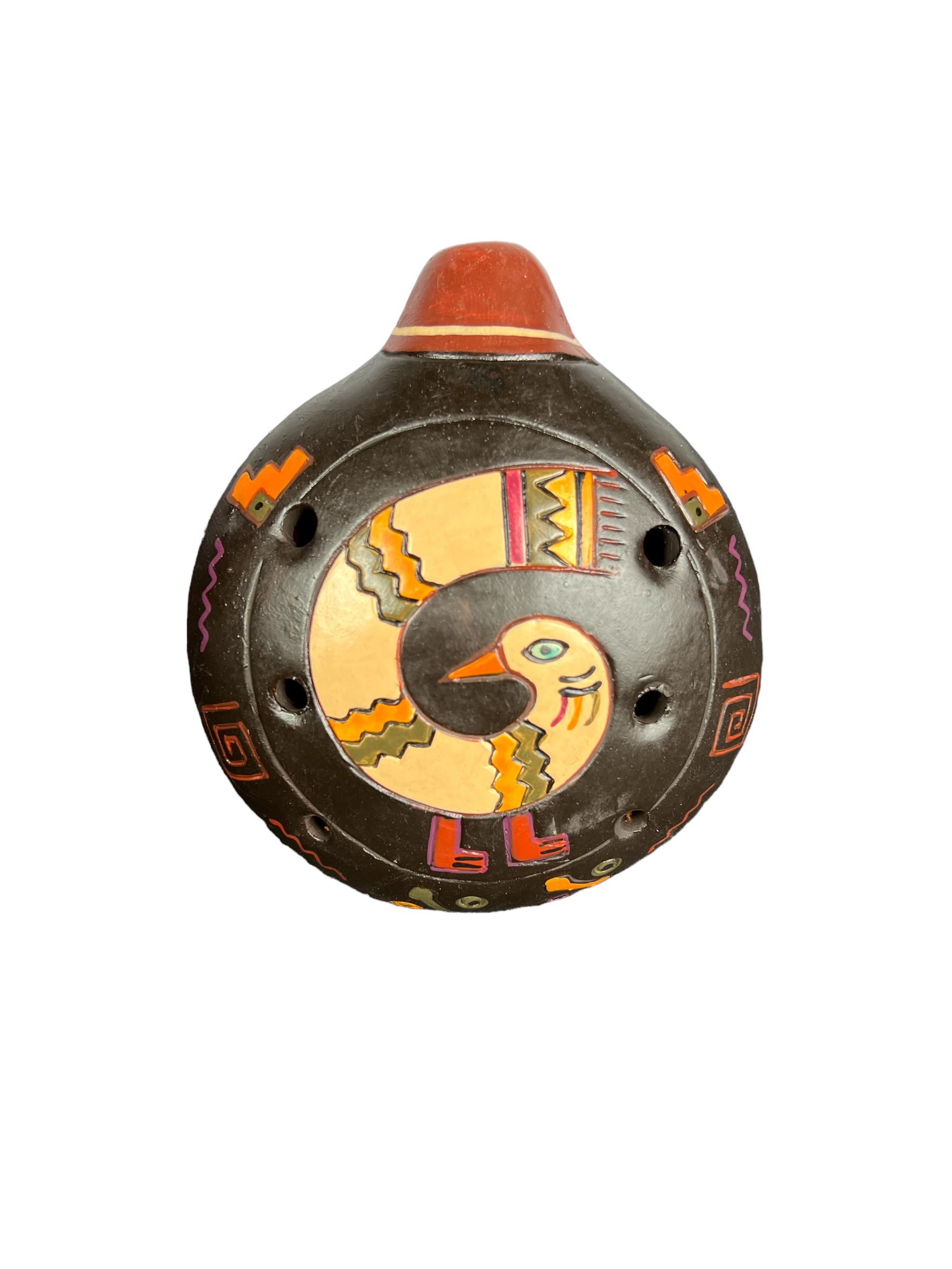 Instrument de musique à vent, en argile, de petite taille, de forme ovale et légèrement allongée, comportant huit trous, 11 notes (deux en dessous et six au dessus) se joue comme la flûte.